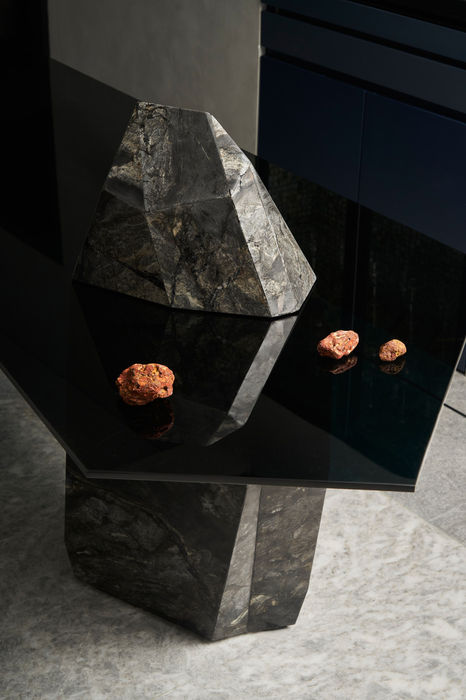 The residence flaunts a plethora of bespoke objects and artifacts, some collected globally some created by RH(a+d), paired with eclectic lighting and furnishing that speak volumes of a curated modern design ethos. Design elements are not just functional; they are art. For instance, the dining area is dominated by a sculptural table with boulder-like Brazilian granite legs and a cantilevered glass top, representing the raw power of geodes, designed to leave visitors in awe. The background features a bar adorned with mother of pearl, showcasing a rare whiskey collection, encapsulating luxury in every detail.